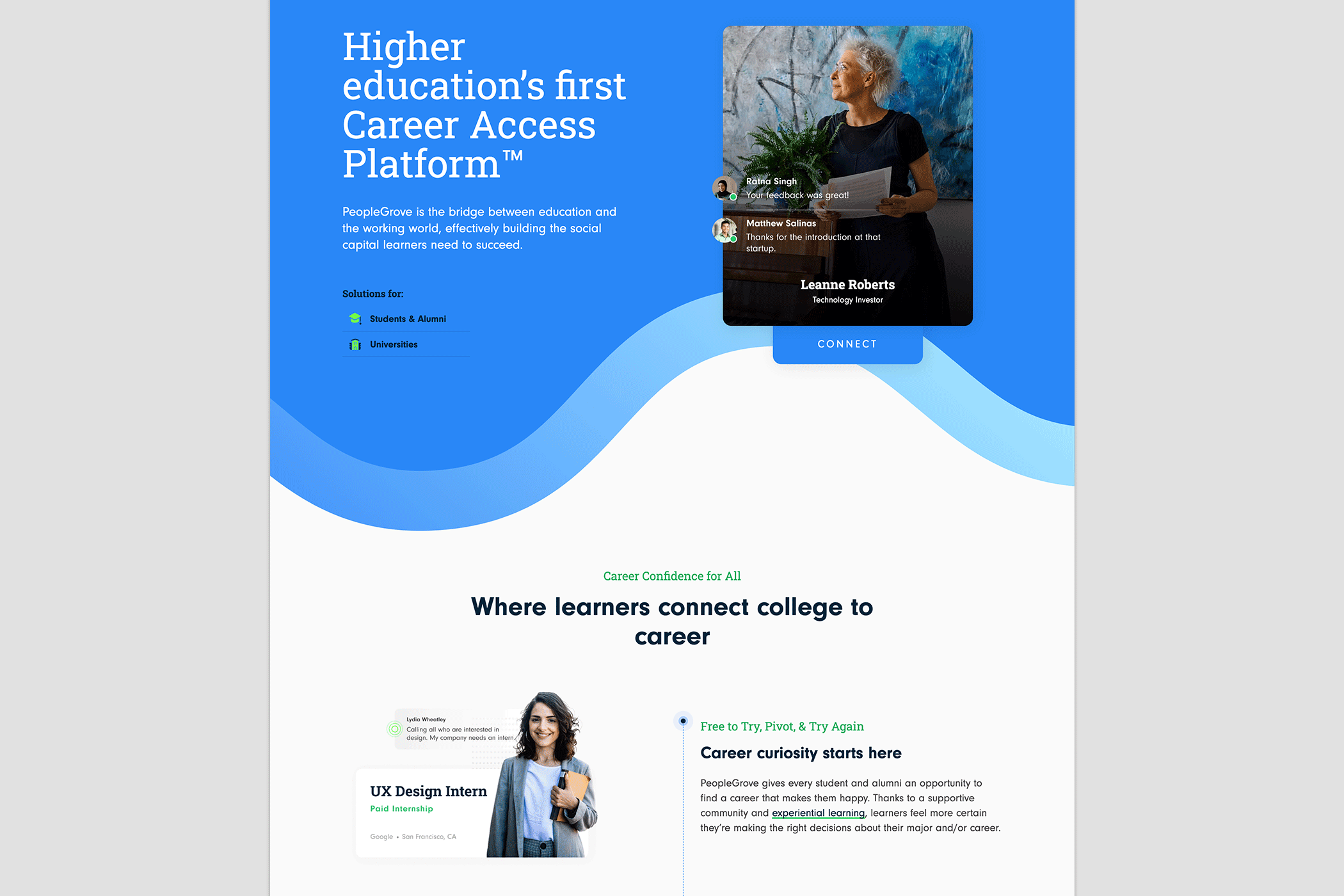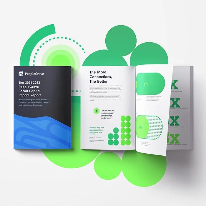 At the core of the rebrand’s concept was messaging: PeopleGrove is the most helpful career network ever created. Like a super-charged version of LinkedIn exclusively for a college or university’s community, it’s how higher education institutions can equitably ensure their students and alumni land the jobs they went to college for in the first place.